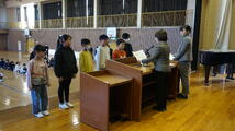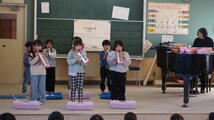 今月の音楽朝会は、1年生の発表でした。音楽の授業で学習した振付や鍵盤ハーモニカ、カスタネットを使って、上手に発表することができました。ほかの学年は、目と耳と心でしっかりと演奏を聴くことができていました。