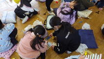 4年生が、応援団の皆さんと育て、収穫したケナフを使って、紙すき体験を行いました。パルプに花びらで飾りつけをして、絵葉書を作りました。